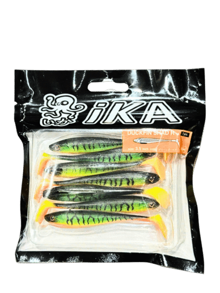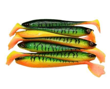 Mồi mềm IKA Cá sọc tông màu xanh – vàng – cam neon rực rỡ, không kèm lưỡi câu.