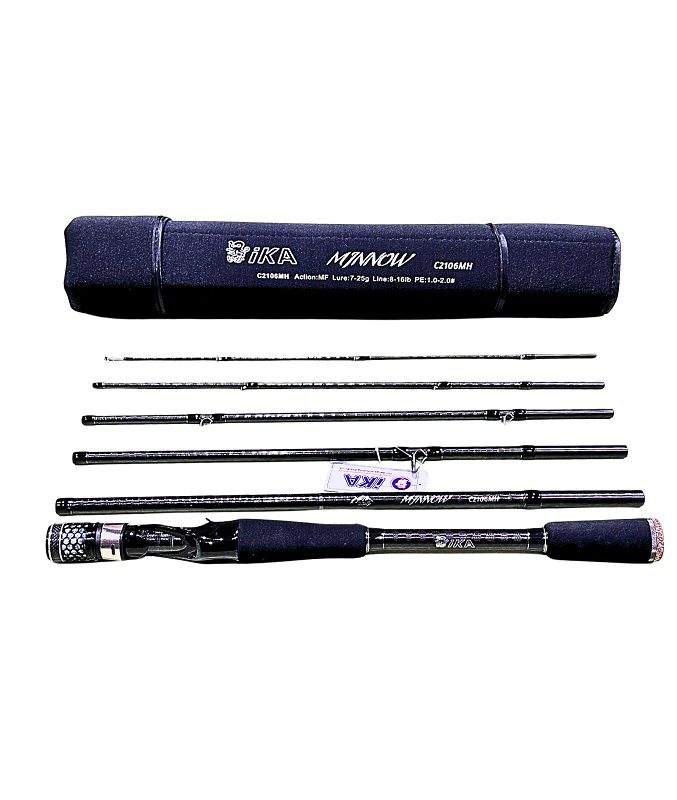 Cần lure 6 khúc IKA Minnow C2106MH thân carbon, action MH, tải mồi 7–25g, line 8–16lb. Phù hợp câu lure cá lóc, cá dữ nước ngọt. Chính hãng Ashino Fishing.